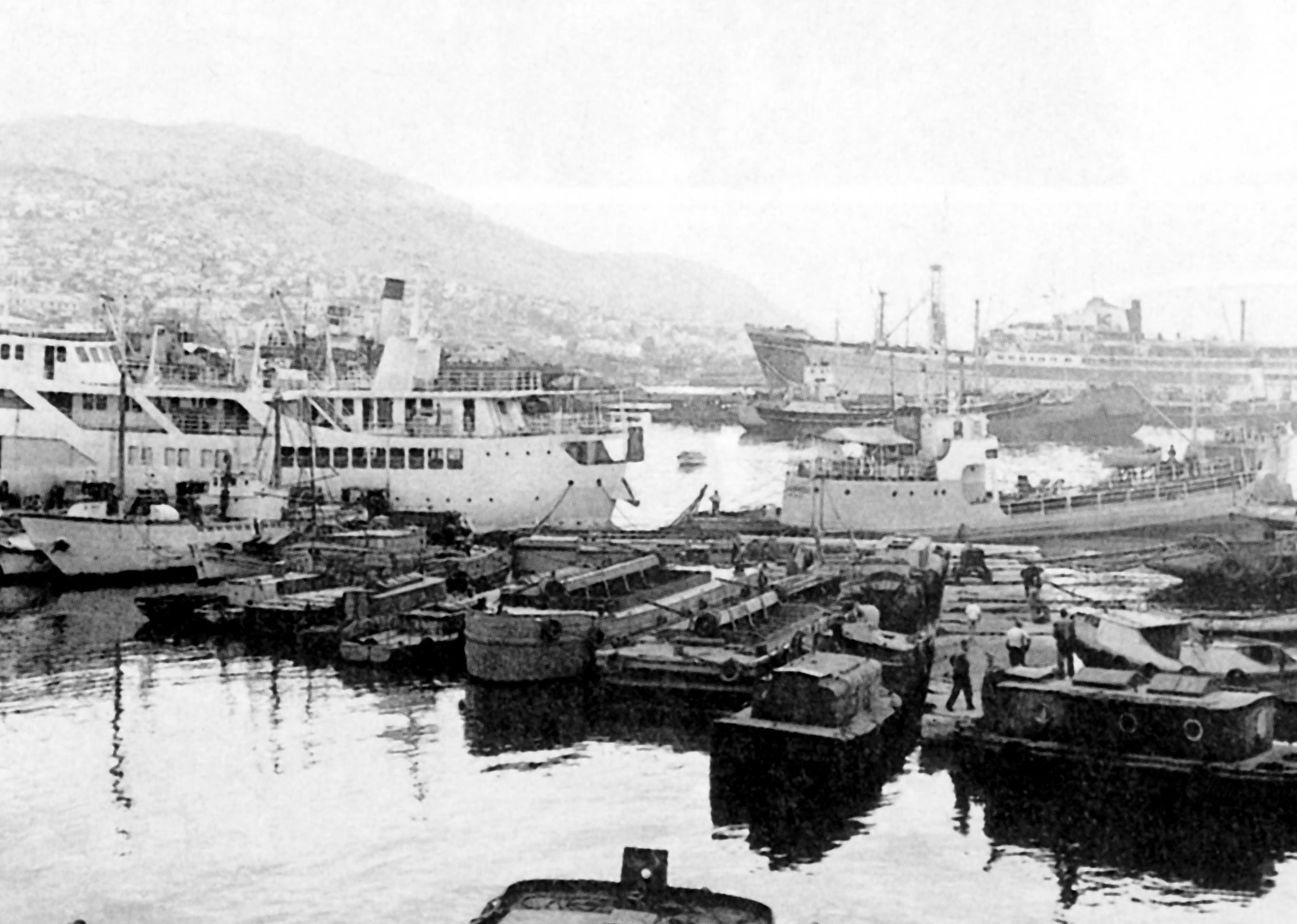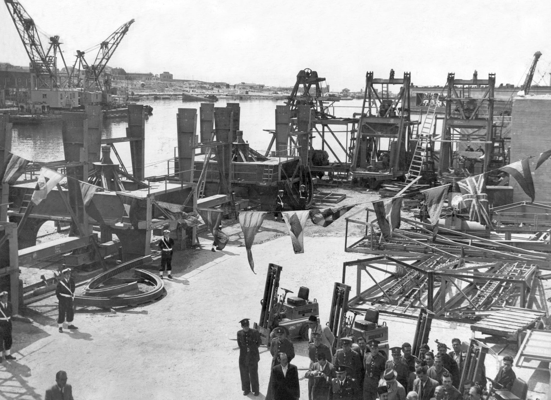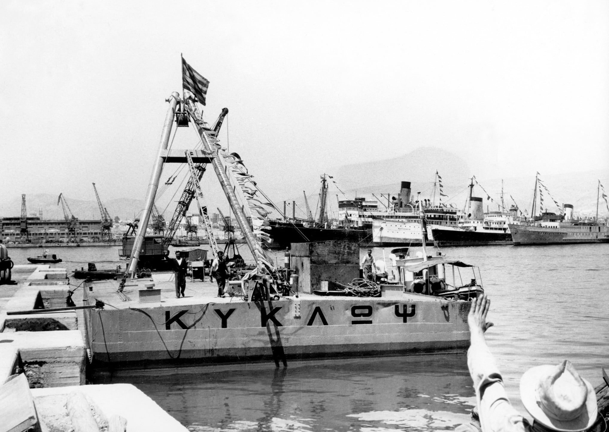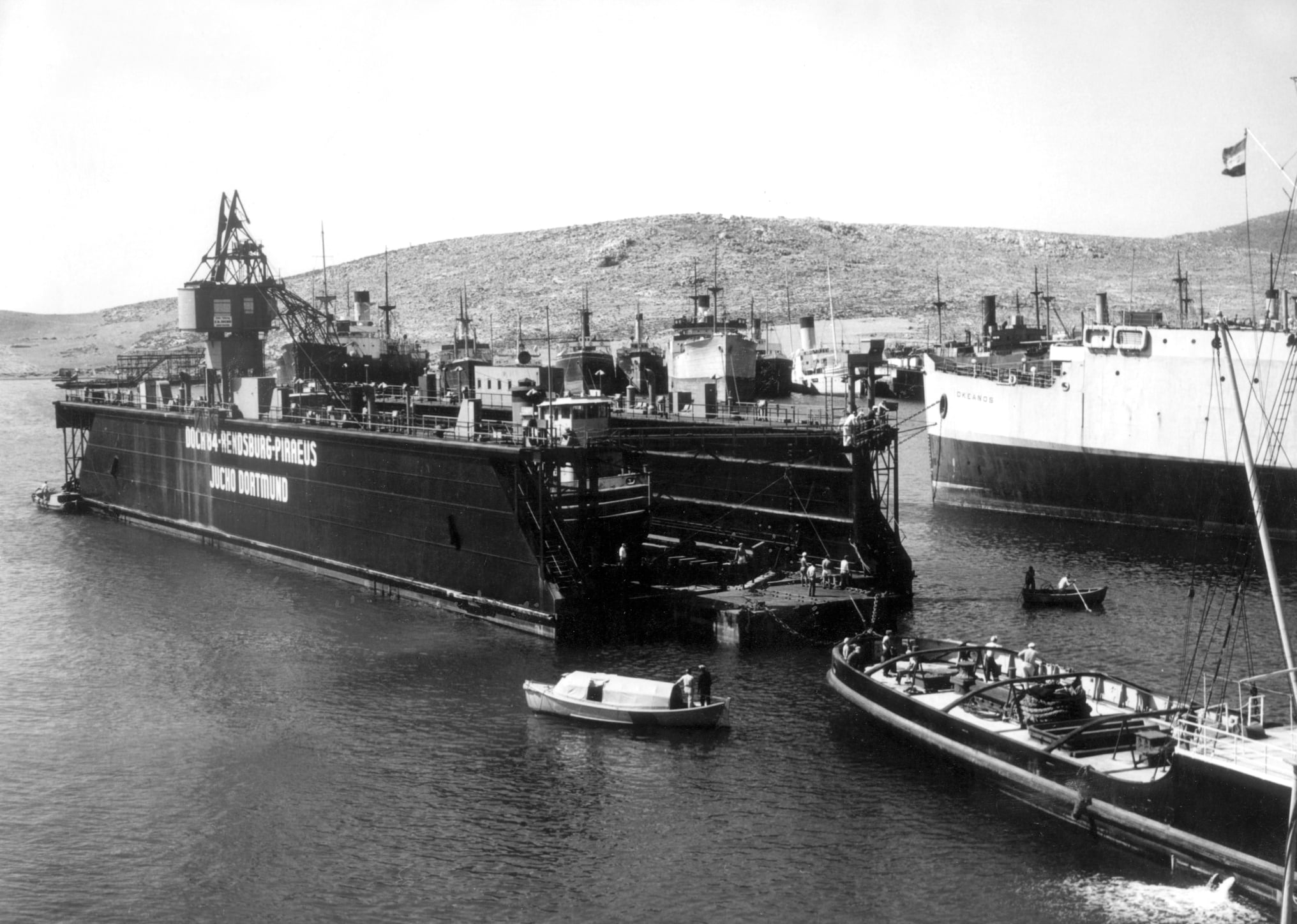 Άφιξη της νέας πλωτής δεξαμενής ναυπηγικής στο Πέραμα το 1960. Αρχείο ΟΛΠ.