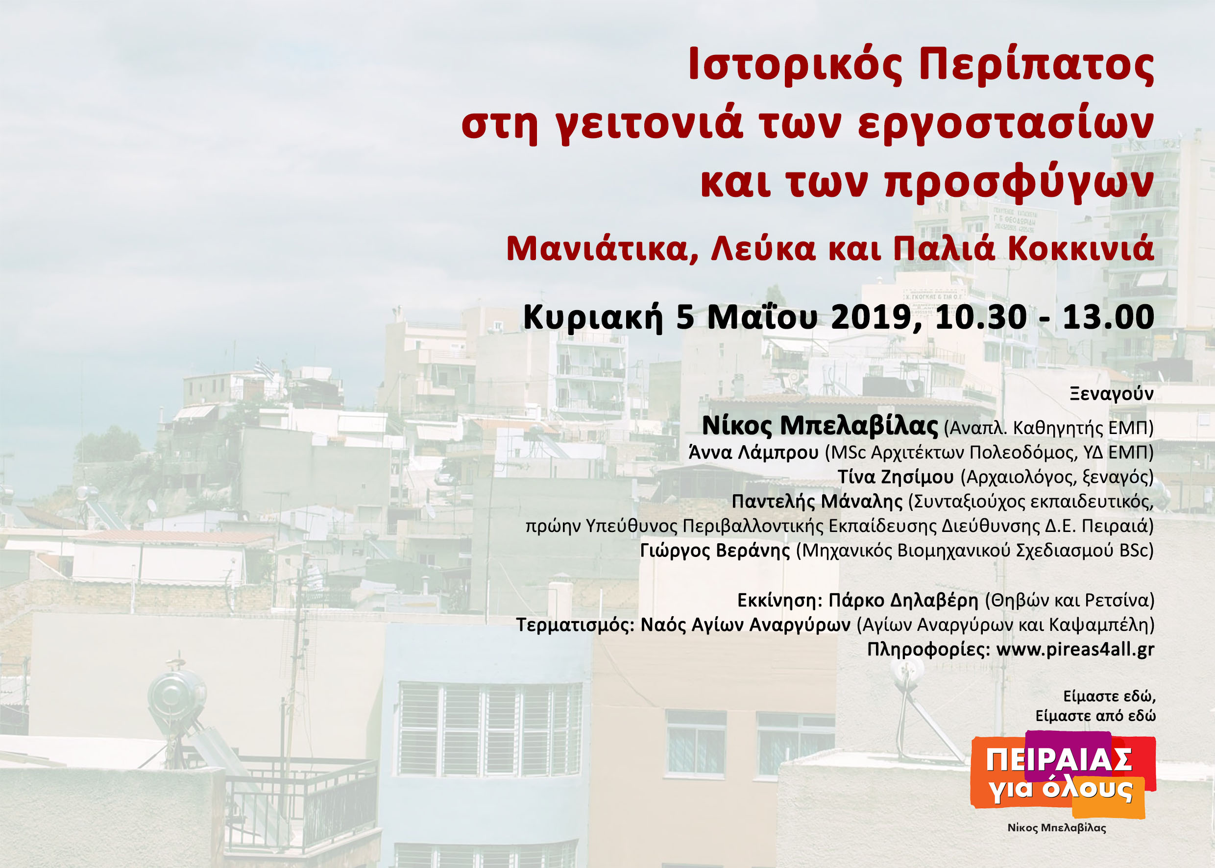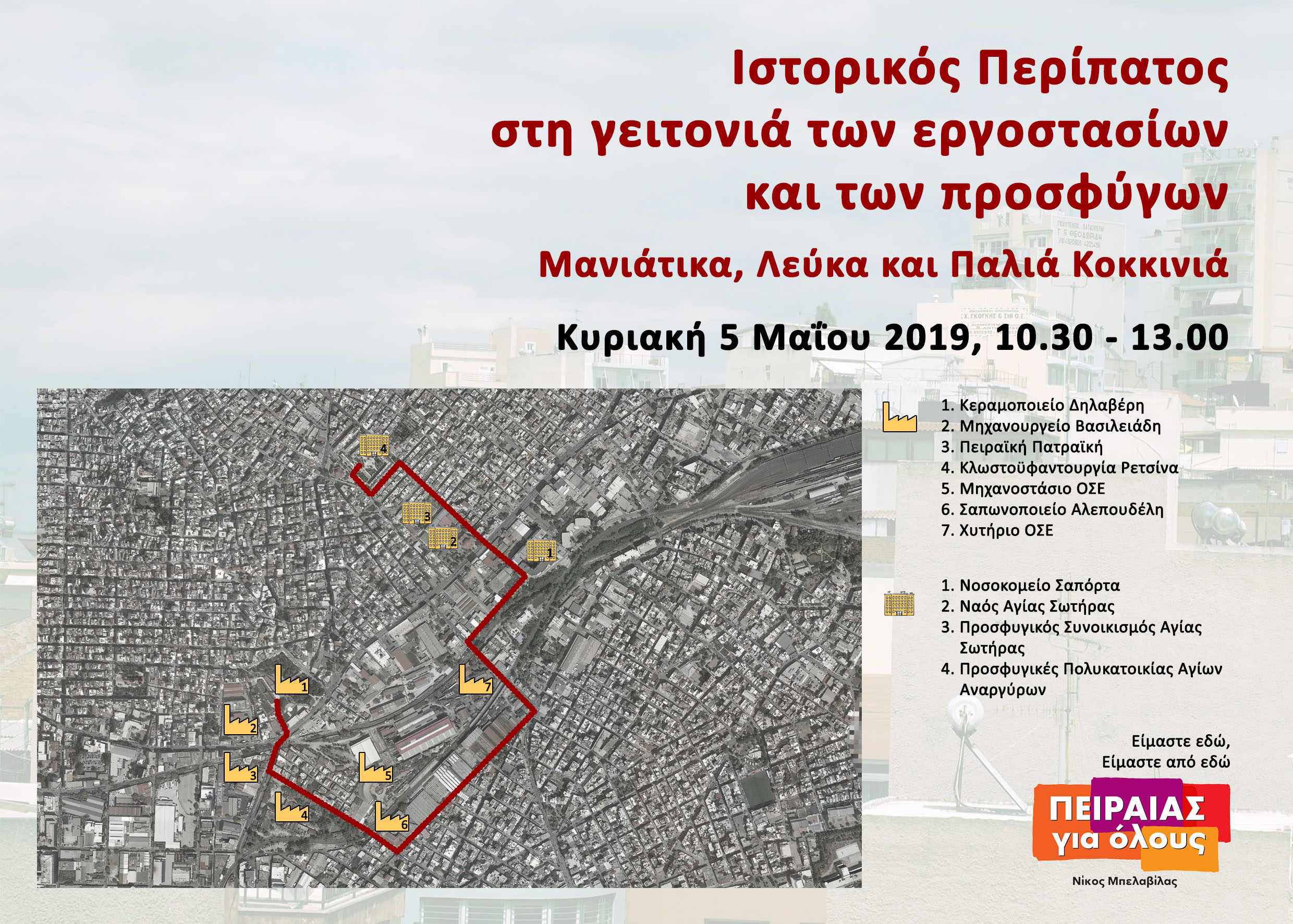 Πραγματοποιήθηκε με επιτυχία, την Κυριακή 5 Μαΐου, ο πρώτος Ιστορικός Περίπατος του «Πειραιάς για Όλους», στη γειτονιά των εργοστασίων και των προσφύγων.