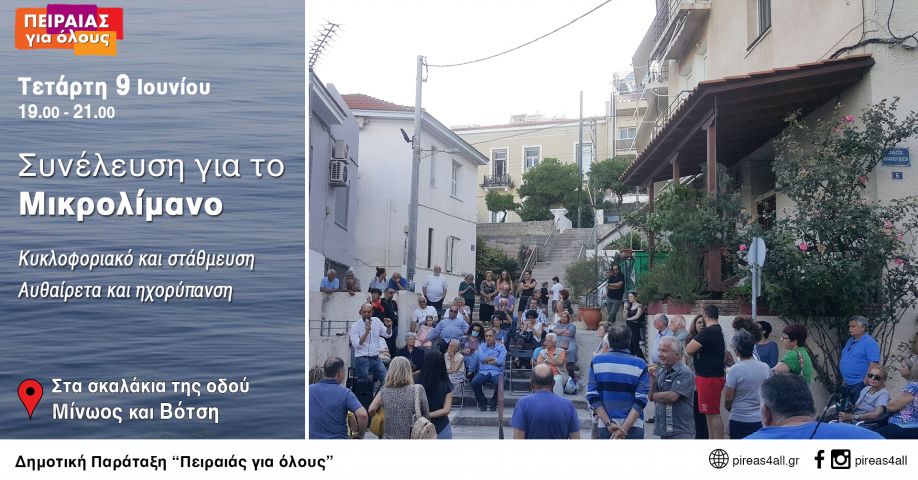 Για αυτό ο "Πειραιάς για Όλους" σε συνεργασία με την Επιτροπή Κατοίκων οργανώνει συνέλευση την Τετάρτη 9/6 στις 19.00 στα σκαλάκια της οδού Μίνωος και Βότση. Θα συζητήσουμε για τα ανοιχτά ζητήματα, το κυκλοφοριακό και τη στάθμευση, τα αυθαίρετα και την ηχορύπανση. Για το δικαίωμα των κατοίκων να ζουν με αξιοπρέπεια στη γειτονιά τους.